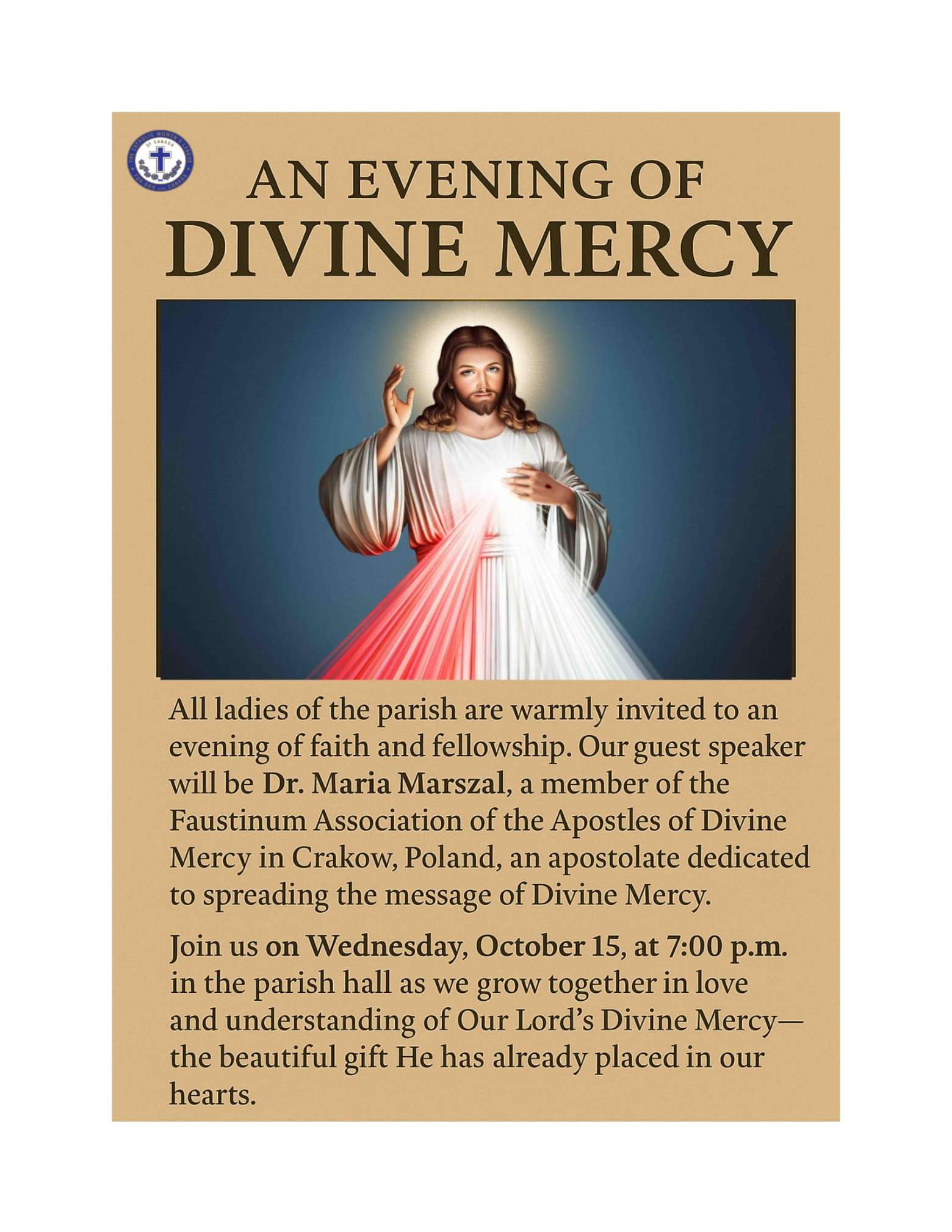 Wednesday, October 15 at 7:00 pm ~ CWL, An Evening of Divine Mercy, Parish Hall