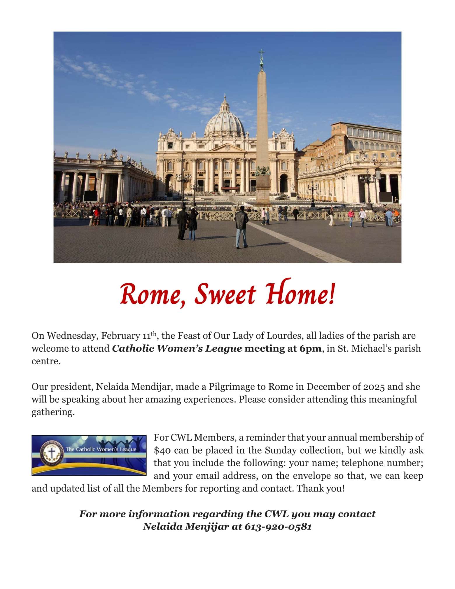 Wednesday, February 11 at 6:00 pm ~ CWL meeting, Parish Hall (Speaker: Nelaida Mendijar)